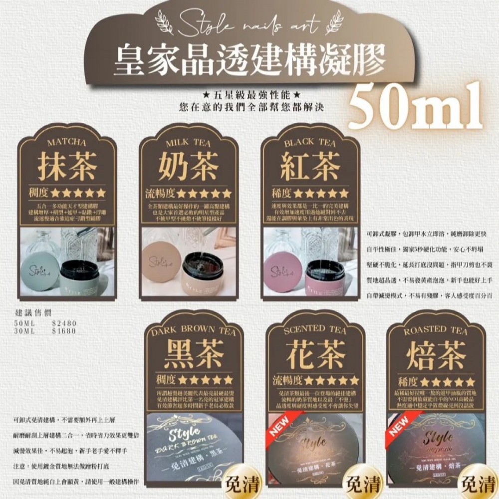 【5秒固化】STYLE皇家晶透/免清建構 (50ml一罐) 抹茶/紅茶/奶茶/黑茶/焙茶/花茶