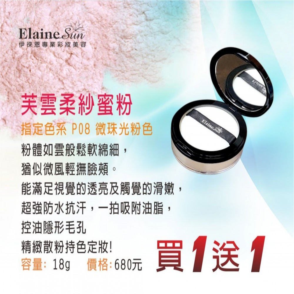 經二次研磨,粉質如雲般鬆軟細綿,如同微風輕拂臉頰。特別添加柔滑因子能滿足視覺的透亮及觸覺的滑嫩。針對油性、乾性肌膚皆可使用。品名:芙雲柔紗蜜粉(含鏡子)