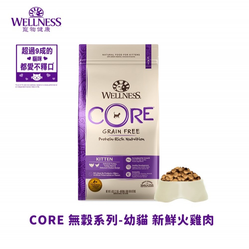 幼貓專屬的無穀食譜,由雞肉、火雞、白魚、鮭魚油和蔓越莓製成,有助於支持您的小貓的最佳健康,並強化了抗氧化劑、益生菌、維生素和礦物質,包括促進皮膚和皮毛健康,Wellness CORE 無穀物貓糧配方是基於貓靠以肉類為主的飲食而茁壯成長的營養理念,為幼貓的成長與健康奠定基礎。