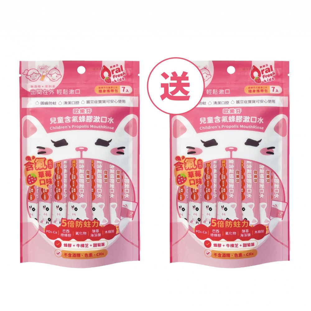 初長牙嬰童、一般幼童皆可使用,將刷牙無法清潔到的部分做口腔清潔。含氟配方兒童漱口水,5倍防蛀力成分升級,獨特添加巴西頂級綠蜂膠、氟化物(225PPM)、POs-Ca、醣基海藻醣、木糖醇、牛樟芝萃取等營養配方,強化琺瑯質並預防齲齒,不含涼感及酒精,草莓口味孩子接受度高。