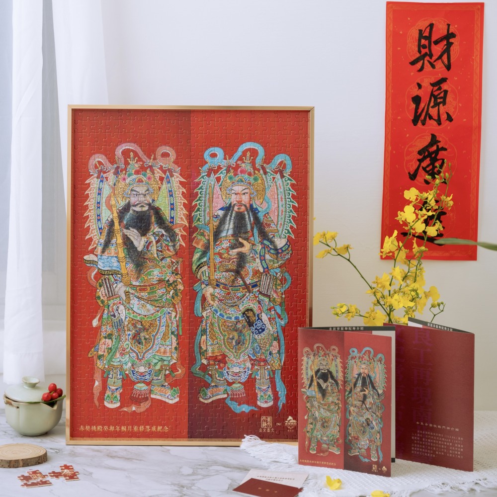 赤馬赤樊桃殿癸卯桐月(112.04)重修入火落成,但門神沿用民國66年(1977)重建時,黃友謙師傅所畫的秦叔寶、尉遲恭和手持香花茶果的四位禮官,這批作品廟方委由在地「良文藝文有限公司」進行修護,讓黃師傅精彩的技、藝再現,也展示了地方深厚的文化資產意涵。特此製作拼圖,以此紀念。