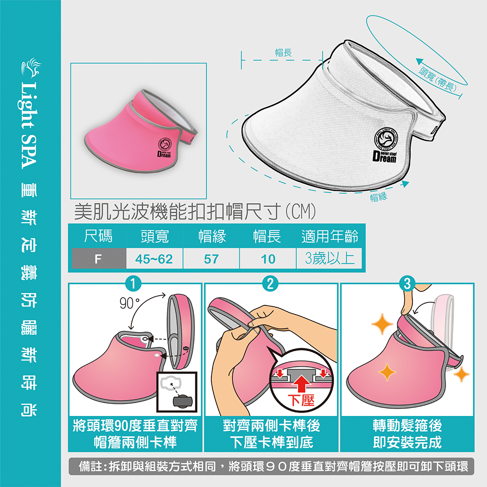 “冰冰帽”造型,保留對肌膚有益的美容光,UPF50+超強防曬,可拆式設計便於旅遊攜帶
